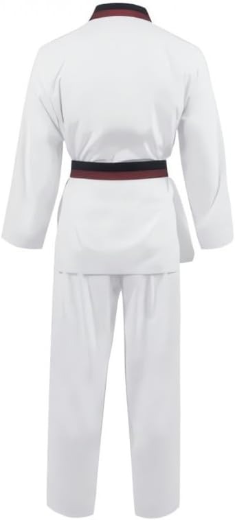 Premium taekwondo outfit from KPNP approved WT (World Taekwondo) ideal for training and competition. Lightweight fabric for freedom of movement. Trousers with elastic waistband and drawstring. Black and red V-neck, long jacket. Quality: Material: 65% polyester, 35% cotton